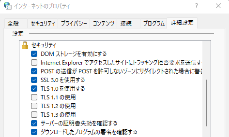 - 設定項目「セキュリティ」のうち、下記にチェックを入れます(セキュリティ項目は下にスクロールしていくとあります)。